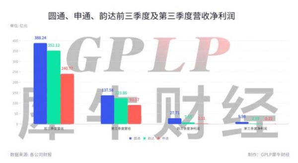 如果仅从绝对值上看,无论是第三季度还是前三季度,无论是营收还是净利润,由大到小排序均为圆通速递、韵达股份、申通快递。但从增速上看,圆通速递和申通快递仍然保持了上半年的高增速,但韵达股份第三季度净利润增速却大幅下滑,以致于令前三季度的净利润也同比降2.05%。