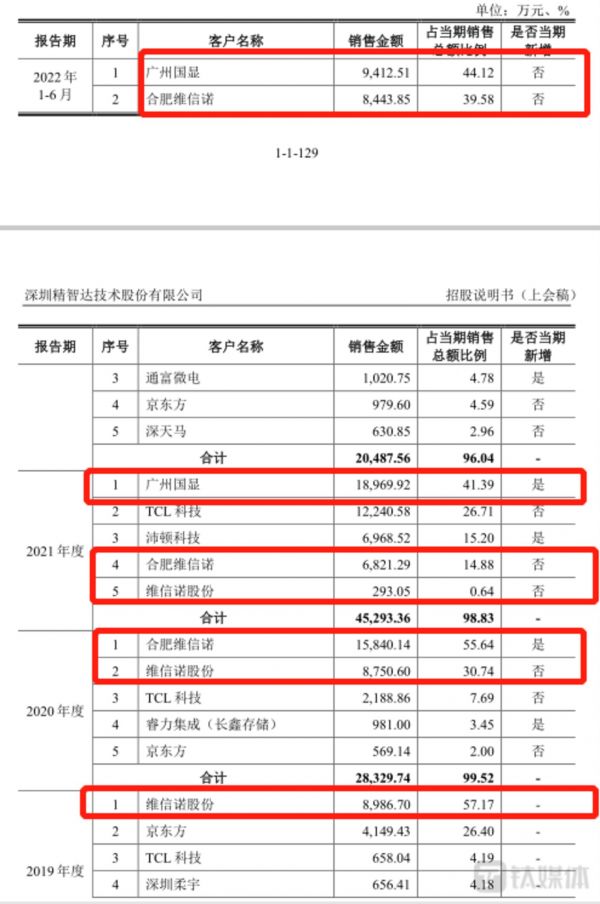 另外,精智达的业绩每年至少有9成的收入时来自前五大客户。2019年-2021年和2022年1-6月(下称“报告期”),精智达向前五大客户产生的销售收入占当期营业收入的比例均超过了93.93%。精智达的前五大客户中不乏较多的知名企业,如京东方、TCL科技等,但更加值得关注的是维信诺。