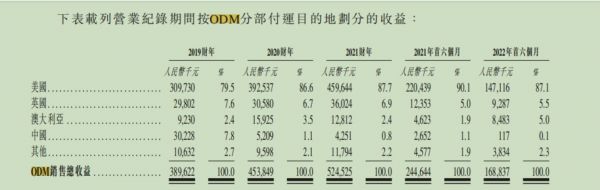 ODM为佳捷康的主要收入来源。招股书显示,2019-2021年及2022年上半年,佳捷康自ODM业务所得收益为3.9亿元、4.5亿元、5.24亿元以及1.68亿元,占总收益的99.5%、76.4%、97%及93.4%。