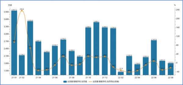 作为中芯国际晶圆产品下游最重要的应用领域,智能手机应用第三季度收入占比达到26%,国内智能手机1-8月累计出货量1.7亿部,同比下降22.9%,前8个月中有7个月出货量呈现出同比下降,且最近7月和8月出货量分别同比下降31.2%和21.4%,仍然呈现出较大降幅,显示出需求持续低迷,手机出货量短期内难有较大增幅。