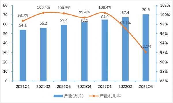 公司近两年晶圆产能保持稳定增长趋势,2021年产能基本保持满产水平,但进入今年以来前三季度产能利用率呈现逐渐下降的趋势,尤其是三季度下降幅度较大,已由一季度的100.4%下降至92.1%,产能利用率的下降也显示出目前市场需求减弱。