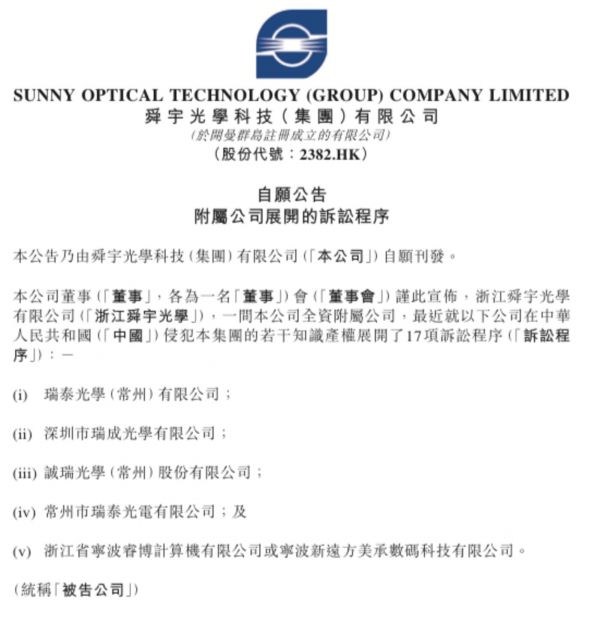舜宇光学科技公告诉讼事宜,截图自公司公告