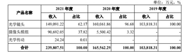 值得注意的是,舜宇光学科技此次诉讼涉及的塑料手机镜头、玻塑混合手机镜头正是诚瑞光学的主营产品。据招股书,在光学镜头板块,诚瑞光学专注于塑料镜头、WLG 玻璃镜片及玻塑混合镜头的研发、制造和销售。2019年-2021年,诚瑞光学光学镜头实现销售收入分别约为10.38亿元、16.01亿元、14.91亿元,占比分别为100%、96.68%、62.17%。