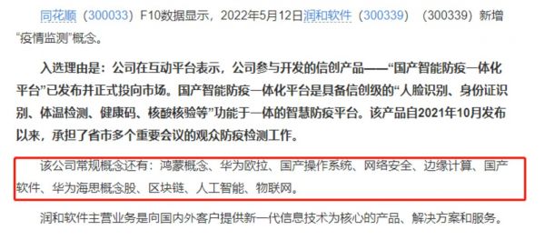 于是,在经历半年多的炒作之后,润和软件的市场热度逐渐冷却。在此期间,公司也在不断增加新概念,诸如元宇宙,区块链,自动驾驶等等。今年5月,公司还增了疫情检测的相关概念,熟悉的戏码再次上演。