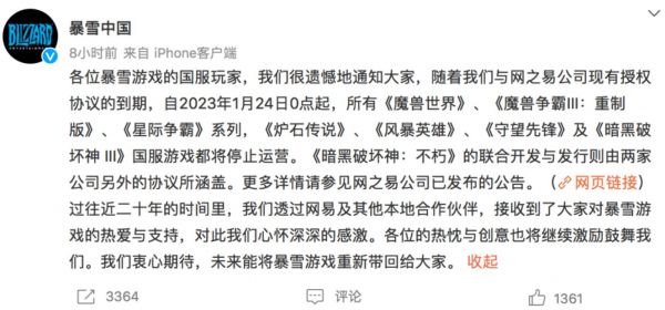 11月17日上午,就在网易即将发布2022年第三季度财报之际,曾合作14年的商业伙伴动视暴雪(以下简称“暴雪”)发布声明称,与网易的合作于2023年1月到期且不再续约,将暂停在中国大陆的大部分暴雪游戏服务,《魔兽世界》《炉石传说》《守望先锋》《星际争霸》《魔兽争霸III:重制版》《暗黑破坏神III》和《风暴英雄》均将于2023年1月24日0点起正式停服。