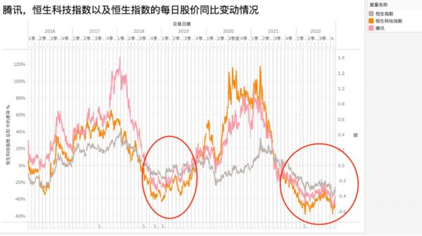 其一,在2018年美联储上一个加息周期内,港股同样面临严峻的流动性紧缺问题,此时腾讯走势介于恒生指数和恒生科技指数之间,此情景在2021年之后又再次重演;