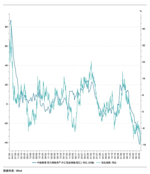我们整理了香港外汇现金储备与恒生指数的同比变动情况,见下图