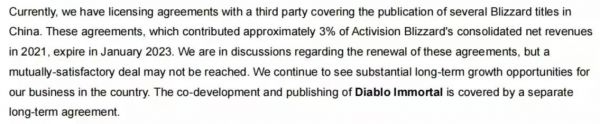 动视暴雪的Q3财报提及,当前续约的协议涵盖了在暴雪中国发布的多款游戏,这些产品约占动视暴雪2021合并净收入的3%。