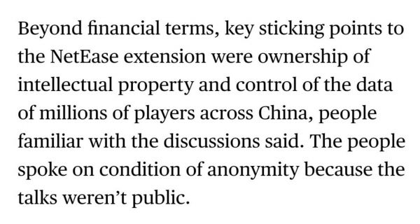 此外,据知情人士给海外知名商业媒体Bloomberg爆料称:暴雪不再和网易合作的原因有两点,一是知识产权所有权的归属,二是网易不肯交出中国上百万玩家的信息数据控制权。