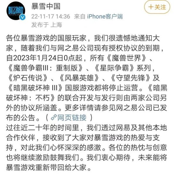 11月17日,暴雪娱乐发布公开声明称:“由于同网易的现有授权协议将在2023年1月23日到期,将暂停在中国大陆的大部分暴雪游戏服务,包括《魔兽世界》《炉石传说》《守望先锋》《星际争霸》《魔兽争霸III:重置版》《暗黑破坏神III》和《风暴英雄》。”不过,声明中特别提到,由于《暗黑破坏神:不朽》的共同开发和发行规则涉及两家公司另外的单独协议,暂不受影响。