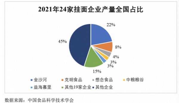 在挂面领域中,根据招股书引援的数据,在国内24家挂面企业中,金沙河排名第一位,市占率达到22%,想念食品排名第三,仅占比4%。换言之金沙河市场占有率是想念食品的5倍。