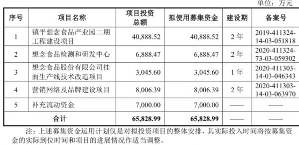 经过调整后的想念食品,此次上市计划募资9.74亿元,发行不超过3600万股,不低于发行后总股本的 25%。其中,6.58亿元用于镇平想念食品产业园二期工程建设项目;4330.27万元用于想念食品挂面车间技改项目;6888.4万元用于想念食品检测和研发中心;2.04亿元用于营销网络及品牌建设项目。