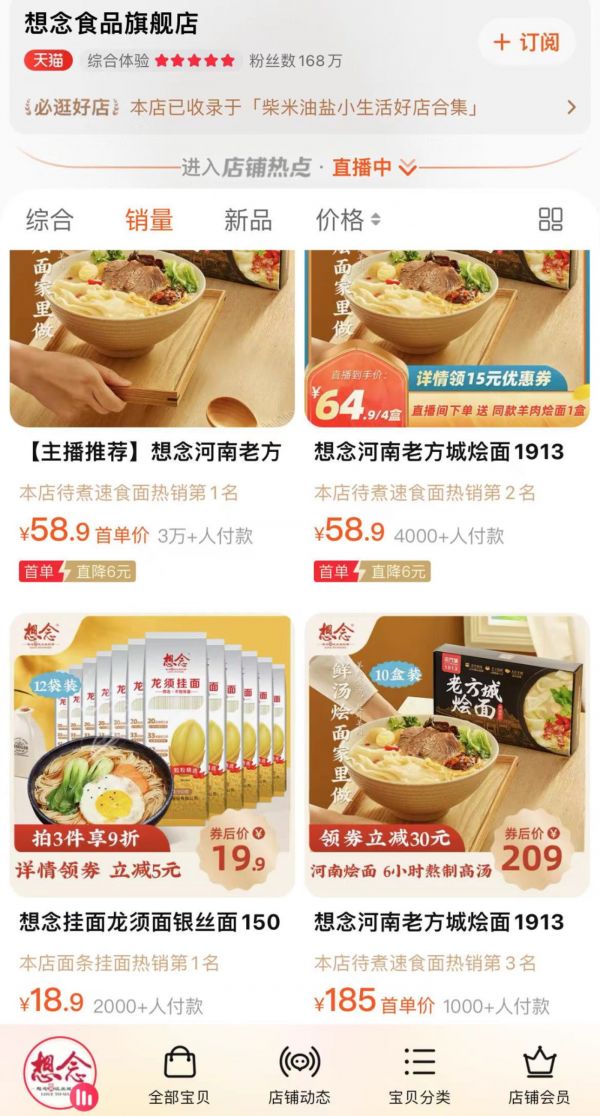 据了解,想念食品近年不断推出“羊肉烩面”“85%荞麦面”“闪面”“番茄牛腩拉面”“泰式冬阴功拉面”“藤椒鸡拉面”、“重庆小面”和“热干面”等各类新产品。其中表现最好的是正宗“羊肉烩面”,3盒58.9元的定价不算便宜。但从配料、工艺、包装、口感而言,都比传统挂面更吸引消费者。