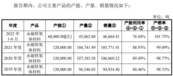 然而需要注意的是,安特磁材募资加码背后,现有产能并未完全满产。据招股书,2019-2021年及2022年上半年,公司产能利用率为80.46%、89.49%、88.95%和76.44%,且今年上半年公司的产销量均不及去年的一半。就相关问题,钛媒体APP试图电话联系公司方面,但始终未能接通。