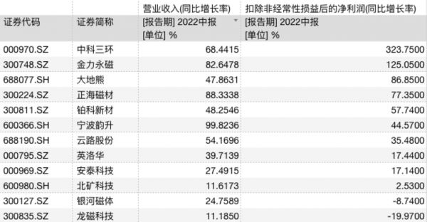 今年上半年,磁材行业上市公司业绩变动情况,数据来源于Wind
