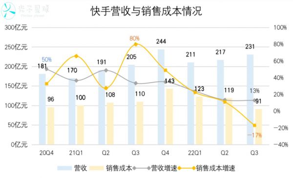 北京时间11月22日快手发布2022年第三季度财报,数据显示,截至9月30日,快手该季度实现营收231亿元,同比增长12.9%。略高于此前市场所预计的225.3亿元。