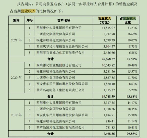 钛媒体APP发现,2019-2021年,盛景微来自前五大销售客户的收入金额分别为7498.85万元、19748.59万元、26868.57万元,占当期营业收入的比例分别为99.85%、93.68%以及75.57%。换言之,盛景微对大客户有很强的依赖度。盛景微认为,公司向前五名客户的合计销售金额占比较大,符合下游民爆行业集中度较高的特点。