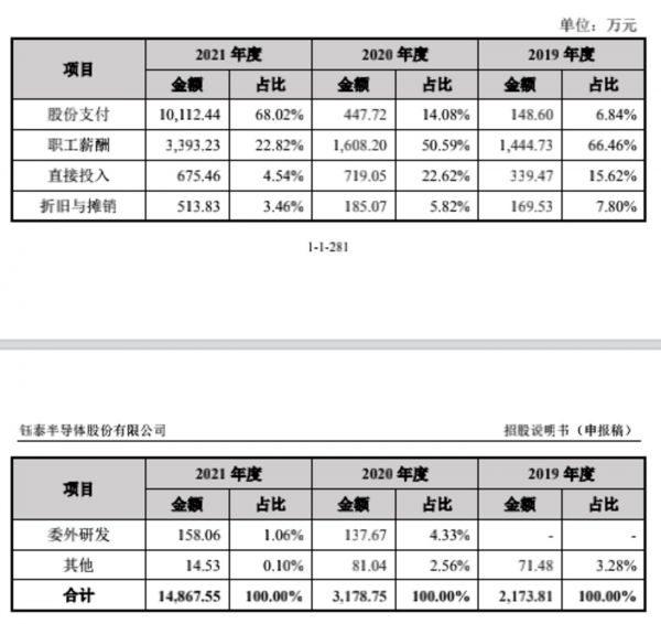 根据招股书,钰泰股份2019年至2021年的研发费用分别为2173.81万元、3178.75万元、1.49亿元。看似2021年研发费用有了大幅增长,但究其原因,系当年有超过1亿元的股份支付金额被计入研发费用。若扣除股份支付,钰泰股份2019年至2021年的研发费用率分别为6.71%、6.52%、5.76%,呈现逐年下降趋势。