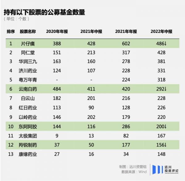 如果我们拿公募基金持股最多的一系列股票来看,2022年二季度布局中药的基金整体上呈现增加趋势。值得注意的是其中对华润三九、济川药业、以岭药业等OTC感冒药投资家数明显增多,对片仔癀以及云南白药等消费型中药持有的机构明显减少。