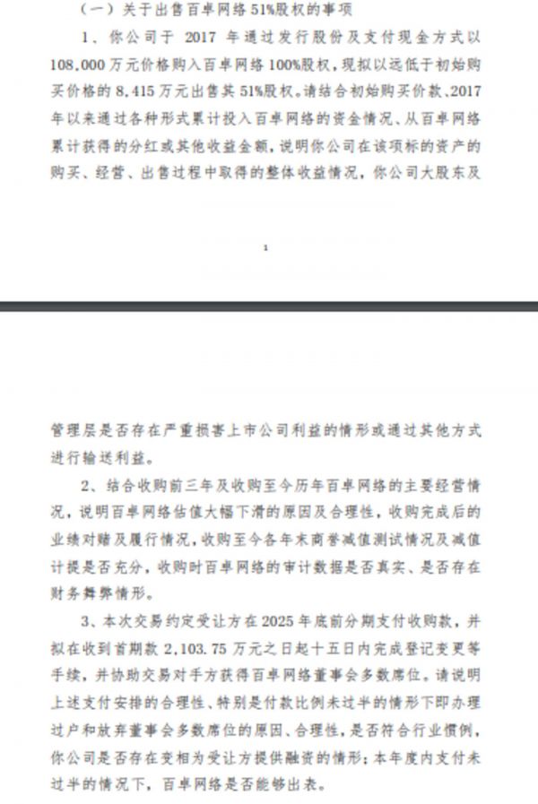 深交所在下发的关注函中,提出付款比例未过半的情形下即办理过户和放弃董事会多数席位的原因、合理性,是否符合行业惯例,公司是否存在变相为受让方提供融资的情形;本年度内支付未过半的情况下,百卓网络是否能够出表的疑问。