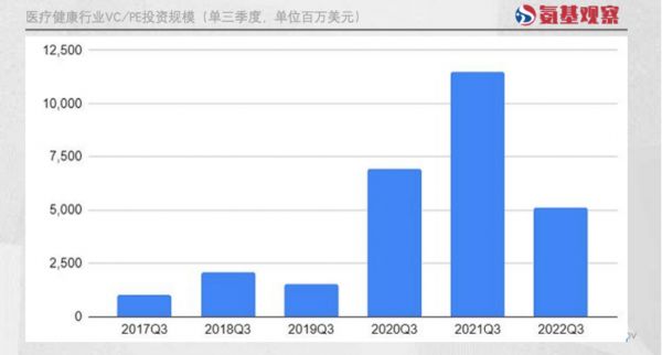 虽然如今的一级市场依然能够提供充足的弹药。2022年第三季度,国内医疗健康行业的一级市场投融资额高达51亿美元,虽然这低于泡沫时期的2021、2020年三季度,但相较于泡沫之前的年份仍然不低。