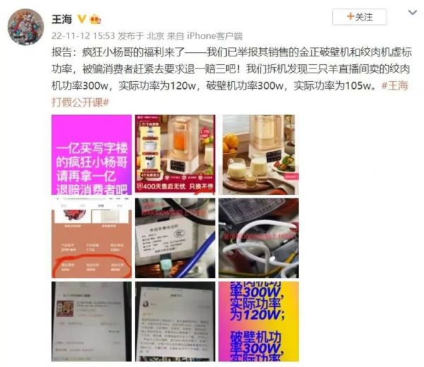 11月12日,职业打假人王海认为疯狂小杨哥直播间售卖的金正破壁绞肉机虚标电机功率,声称对方需要再拿出一亿退赔消费者。