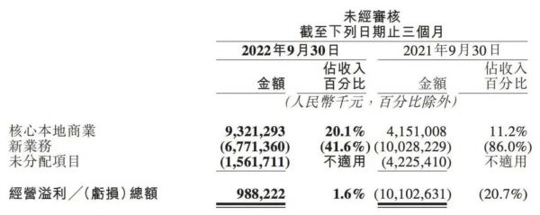根据财报,受商品零售业务的增长推动,2022年第三季度,新业务部分收入达163亿元,同比增长39.7%,较上季度41%的增速略微下降;经营亏损由2021年第三季度的100亿元减少至今年同期的68亿元,经营亏损率由86.0%同比改善至41.6%。