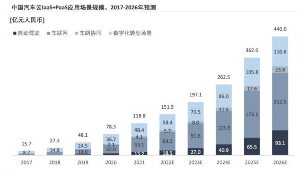 目前自动驾驶云仍处于市场化的早期阶段。《2021年中国汽车云市场追踪报告》显示,2021年中国汽车云IaaS+PaaS落地应用场景中,自动驾驶只有13亿元的市场规模,占比为11.1%。