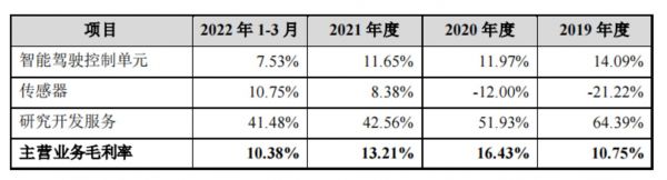 据招股书显示,报告期(2019 年、2020 年、2021 年及 2022 年 1-3 月)内纵目科技的主营业务毛利率分别为10.75%、16.43%、13.21%和10.38%,有逐年下滑的趋势。