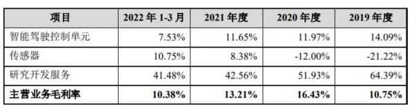成为一级供应商之后,纵目科技开始与车企进行利润博弈。2019年、2020年、2021年及2022年前3个月,纵目科技前五大客户的收入分别为4440.81万元、7486.54万元、1.63亿元和7771.61万元,占比分别为89.42%、89.31%、71.84%、86.32%。同期,纵目科技主营业务毛利率分别为10.75%、16.43%、13.21%和10.38%,相对较低。
