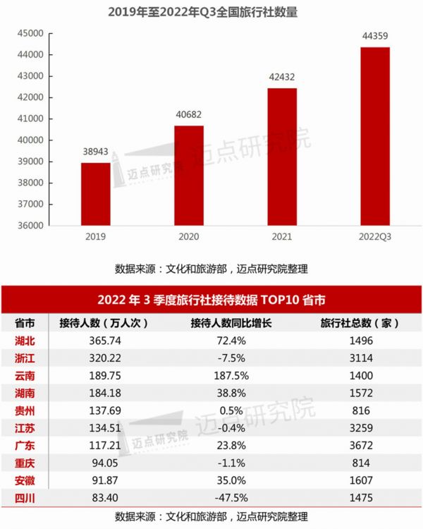 值得注意的是,比较2019年至2022年三季度全国旅行社数量,可发现一个有趣的现象:疫情近三年,旅行社的数量不减反增,逆势增长。据业内专家解释,原因主要分为两类:增量主要源于研学培训机构的转注册、旅行社原股东分立新设、自驾俱乐部注册开发新业务及其外行跨界入局例如抖音、小红书、滴滴这些互联网企业直接从旅行社入手进入旅游行业;存量系原有旅行社选择“蛰伏”,暂停营业,不做清算,即使旅行社不开展经营业务,但依然存在。