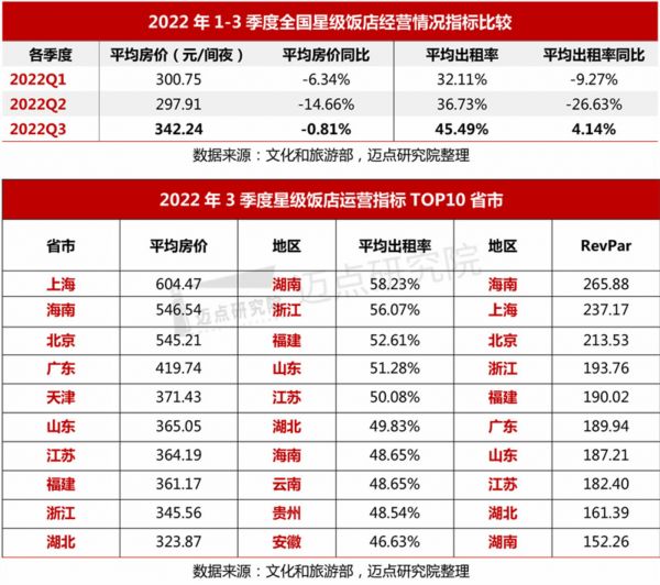 2022年三季度,受疫情反复散发及严格管控政策影响,酒旅行业仍处于震荡不稳定发展状态。据文化和旅游部公布的全国星级饭店经营情况数据:第三季度,共有6505家星级饭店数据通过审核,营业总收入353.54亿元,其中餐饮收入占41.42%,客房收入占41.66%。星级饭店平均房价342.24元/间夜,同比下降0.81%;平均出租率45.49%,同比上升4.14%。环比层面,得益于暑期传统旅游旺季的加持,平均房价相比二季度增加14.88%,平均出租率环比增加8.76%。对比同比数据,整体而言,2022年前三季度全国星级饭店经营情况不如去年。