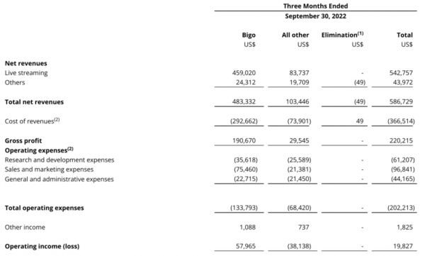 从营收金额来看,根据财报数据,欢聚集团 2022 年 Q3 总营收为 5.87 亿美元,同比下降 9.8%,环比下降 1.5%。自 Q1 开始的连续三个季度营收下降,这在某种程度上也算一个危险的信号。