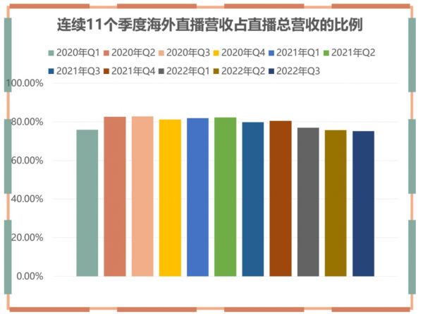 Q3 直播营收为欢聚集团近 8 季度营收最少的一次,官方在财报中解释直播营收的下降,主要受全球宏观经济不确定性以及美元升值的影响,这也在侧面说明欢聚的不少营收来自于非美元区。