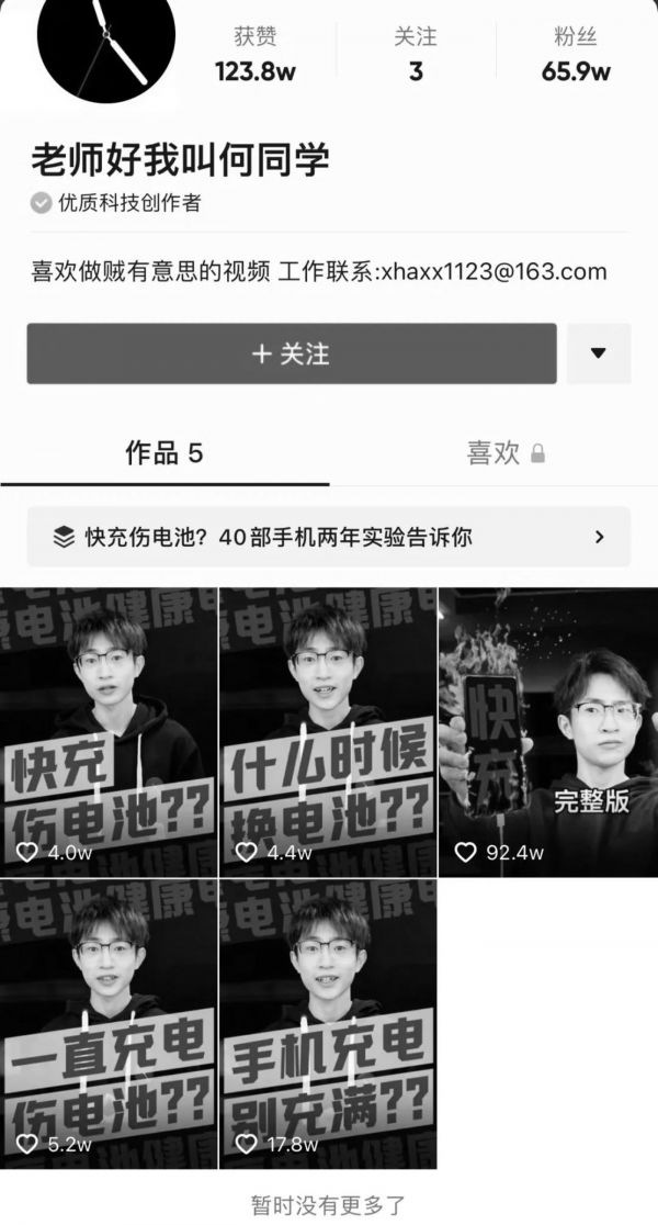 截至11月28日,何同学抖音账号仍为10月27日更新的5条内容(这与其在B站的内容更新周期基本保持一致),但总粉丝数已达到66万,单条视频获赞数高达92.4万。也就是说,在其没有更新的这一个多月里,他的抖音账号依然吸粉近20万。