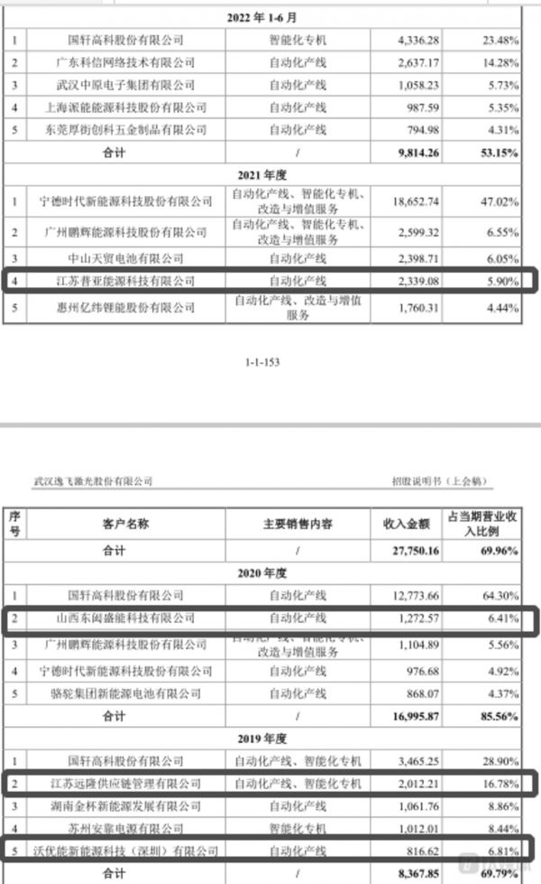 招股说明书显示,2019年和2020年,逸飞激光向国轩高科产生的销售收入分别为3465.25万元、12773.66万元,国轩高科也霸占着逸飞激光的第一大客户头衔。然而,2021年,国轩高科不仅不是逸飞激光的第一大客户更是从前五大客户名单中消失,到了2022年上半年,国轩高科又成为了逸飞激光的第一大客户。