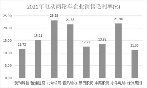 但在对比整个行业的毛利率水平后,钛媒体APP发现,“毛利率处于低位”似乎是整个电动两轮车的行业困境。以2021年的数据为准,毛利率水平表现较高的分别为九号公司和春风动力,但两者并非单一的电动两轮车概念股,而是包含了滑板车、电动摩托车等其他概念,如果单看两家企业的电动两轮车毛利率,则分别为11.19%和19.71%。而专注于电动两轮车的企业诸如爱玛科技、新日股份毛利率则并没有比绿源集团高多少。