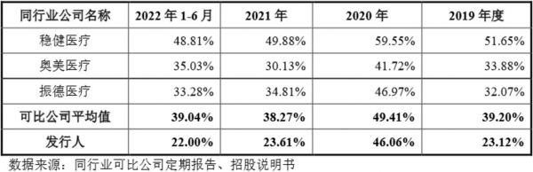 数据显示,健尔康2019年至2022年上半年毛利率分别为23.12%、46.06%、23.61%、22%,而以稳健医疗(300888.SZ)、奥美医疗(002950.SZ)、振德医疗(603301.SH)为代表的可比公司毛利率平均值在同期分别为39.2%、49.41%、38.27%、39.04%,公司毛利率远低于行业均值。对此,健尔康并未作过多解释,仅表示主要因产品结构和客户结构存在差异等原因所致。