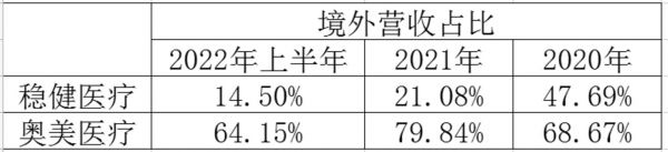 事实上,以稳健医疗、奥美医疗、振德医疗为代表的同行公司都是采取“OEM代工+自主品牌开发”的业务模式,但为何这些公司能获得更高的毛利呢?主要源于它们对于境外、境内业务比例的调整,2020年至2022年上半年,稳健医疗的境外营收占比分别为47.69%、21.08%、14.5%,逐年大幅下降;奥美医疗境外营收占比分别为68.67%、79.84%、64.15%,整体呈下降趋势。