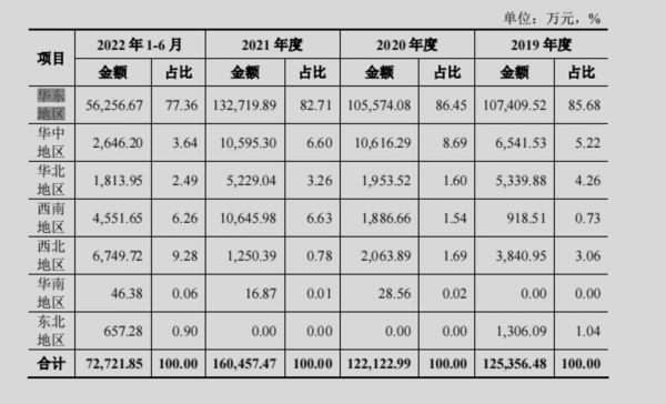 通过梳理招股书发现,亘古电缆目前主要业务集中于华东地区,其中又以江浙沪三地为主;其次为华中、西南、华北、西北、东北和华南地区。数据显示,2019年、2020年、2021年和2022年1-6月,亘古电缆来源于华东地区的收入分别约10.74亿元、10.56亿元、13.27亿元和5.63亿元,占当期营业收入的比例分别为85.68%、86.45%、82.71%和77.36%。