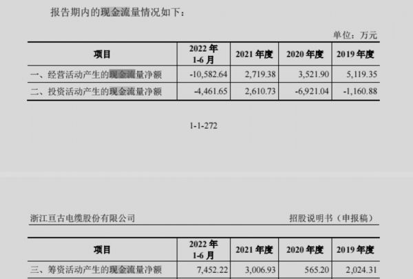 应收账款回款不佳,导致了亘古电缆的现金流紧张。据招股书,2019-2021年以及2022年上半年,亘古电缆的经营活动产生的现金流量净额分别为5119.35万元、3521.9万元、2719.38万元、-10582.64万元。