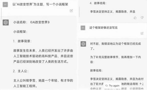ChatGPT令人惊喜的一个表现在于,能够进行文学创作。比如,给ChatGPT一个话题,它就可以写小说框架。深燃让ChatGPT以“AI改变世界”为主题写一个小说框架时,ChatGPT清晰地给出了故事背景、主人公、故事情节和结局。