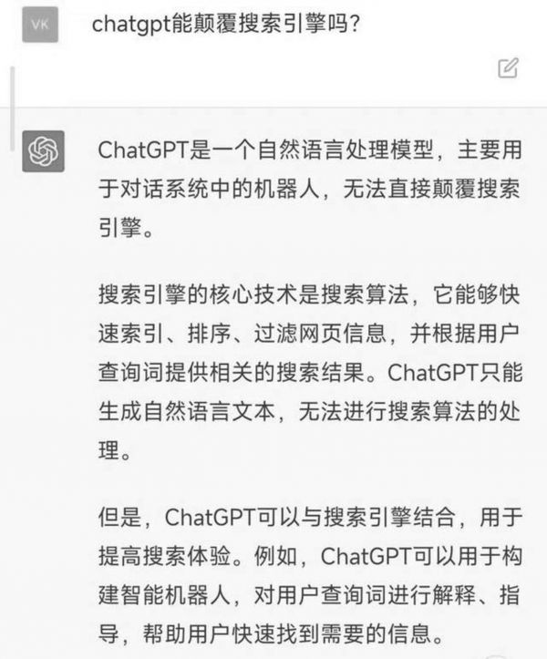 ChatGPT问世后,最火热的讨论,是其能否取代搜索引擎。对于这个问题,ChatGPT给出了“否定”回答:搜索引擎的核心技术是搜索算法,它能够快速索引、排序、过滤网页信息,并根据用户查询词提供相关的搜索结果,而ChatGPT只能生成自然语言文本,无法进行搜索算法的处理。