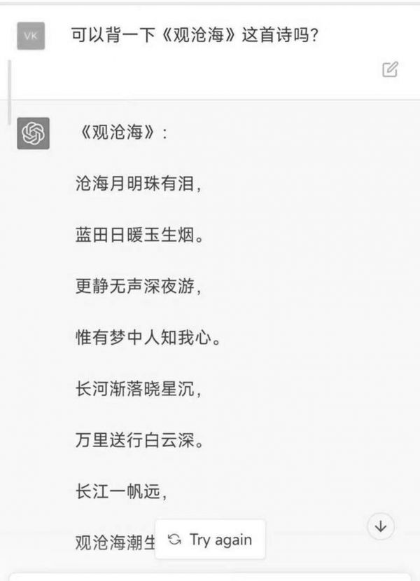 比如,让ChatGPT背一下《观沧海》这首诗,它却即兴创作了一首。