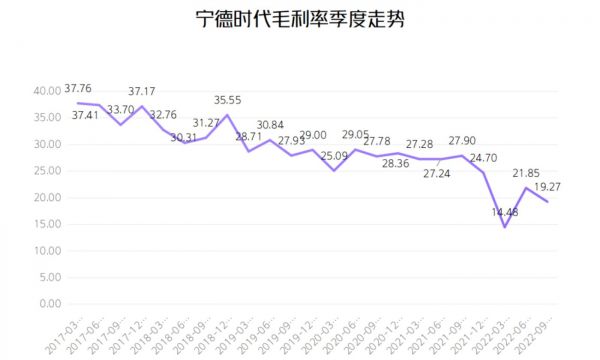 综合宁德时代季度趋势走向来看,亦是呈现逐年下降的态势。