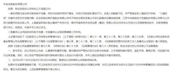 据证监会官网显示,华金证券存在两项违规。具体而言,一是投资银行类业务内部控制不完善。存在内控组织架构不健全、对投行项目团队管控不力、合规人员配备不足、未严格落实收入递延支付机制、“三道防线”关键节点把关失效等问题;在吉林碳谷碳纤维股份有限公司向不特定合格投资者公开发行股票并在精选层挂牌、江苏中成紧固技术发展股份有限公司首次公开发行股票并在创业板上市、上海香溢花城长租公寓资产支持计划、锦州市国有资本投资运营(集团)有限公司2020年非公开发行公司债券等项目中,尽职调查明显不充分,但质控、内核未予以充分关注;二是廉洁从业风险防控机制不完善;未按廉洁从业规定聘请第三方机构。