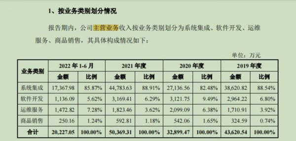 目前,网进科技的业务类型包括系统集成、软件开发、运维服务等,主要客户包括政府单位及企事业单位,应用于公安、政务、交通、医疗、建筑等行业。其中系统集成收入为第一大业务,该业务占各期营业收入的比例分别为88.54%、82.48%、88.91%、85.87%。