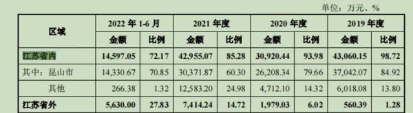 根据前一次招股书,网进科技的业务区域呈现集中特点,90%以上的收入都源于昆山市。数据显示,2017-2019年以及2020年一季度,网进科技在江苏省内实现的营收占比分别为97.34%、99.26%、99.24%和92.08%,其中,在昆山市内实现的营业收入占比高达92.38%、96.9%、97.07%和91.86%。