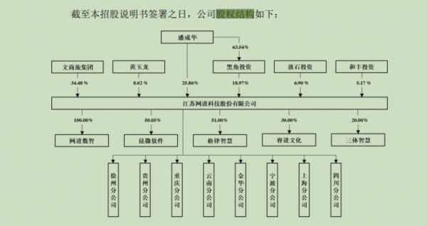 最新招股书显示,昆山市国资委下属的昆山文商旅集团有限公司(曾用名昆山阳澄湖文商旅集团有限责任公司,以下简称“文商旅集团”)持有网进科技34.48%股权;公司董事长、总经理潘成华直接持有网进科技25.86%股权;公司员工持股平台黑角投资持有网进科技18.97%股权;黄玉龙持有网进科技8.62%股权;敦石投资、和丰投资分别持有网进科技6.9%和5.17%股权。