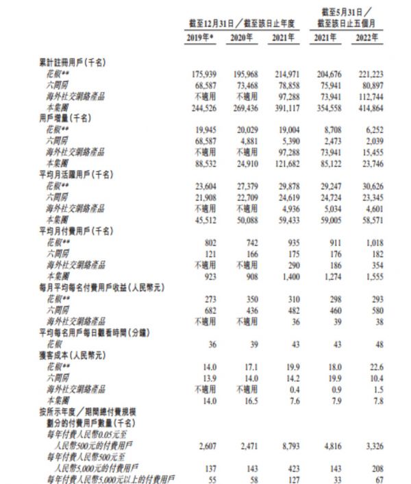 2019年、 2020年、 2021年及截至2022年5月31日五个月,花房集团来自花椒的营收分别为21.7亿元、28.1亿元、32.5亿元、13.7亿元,占总营收的比重分别为76.5%、76.3%、70.7%及66.1%。
